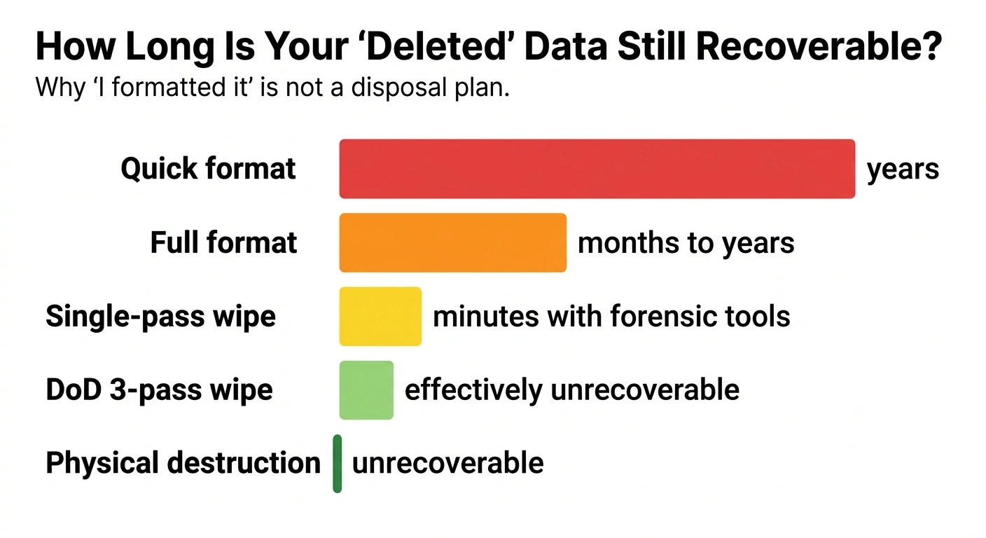 No. Deleting files only removes the index that points to the data, and a quick format leaves most of the data recoverable for years using free tools. Even a full format can leave information accessible to forensic recovery. Safe disposal requires either a verified multi-pass wipe or physical destruction of the storage media.